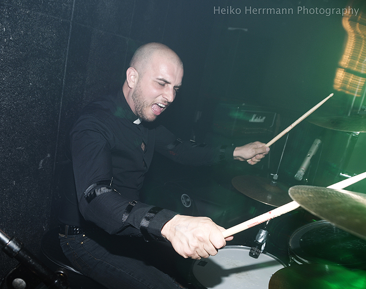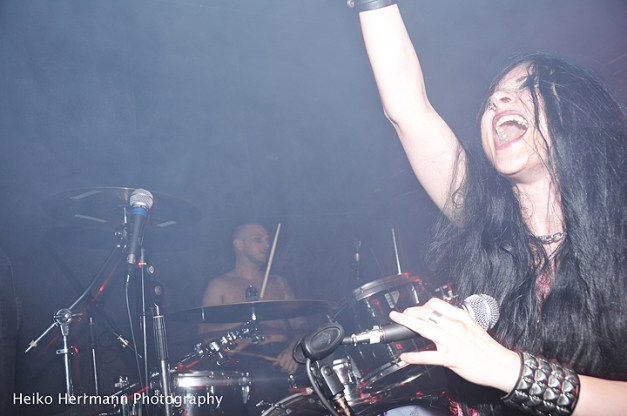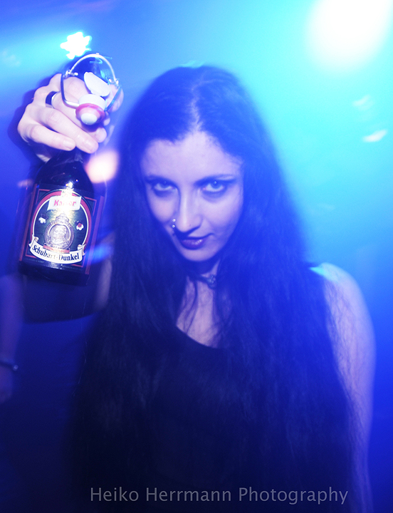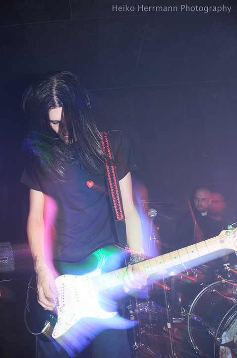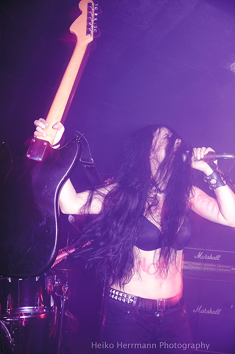 Goeppingen stands out because of the Give Me Noise Festival and because of the Betty+Pandora photoshooting by the amazing Heiko Herrmann. Our “chill out room” on the evening of the gig is a deconsecrated church. Above the kitchen sink there’s the ultimate picture: an image of the Pope surrounded by a ring of pierced condoms, each one with a cross in its middle. Below that, the writing “deo gratias”. The other acts are a grunge band and a wild powernoise band, whose singer performs in a lamé outfit with white-rimmed sunglasses. I enter the stage in a bra, with writings all over my body like “Betty Poison”, “Beauty is Over”, “Give me noise festival” and “The best head I ever got in my life”. I sings a couple of songs with Pandora and then we let Betty’s concert kick off. I’m handed a bottle of Amaro Ramazzotti and i throw it down my throat, over my face and all over myself. The songs run powerfully past and the atmosphere is boiling hot. Mirko is wearing a priest’s outfit and people ask him if he is a molester. The music runs wild and on the last song – due to never clarified technical issues – my guitar stops working. I throw the mic on the ground, I lay beside it and start screaming from there.