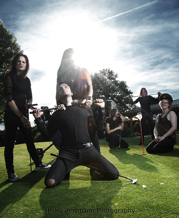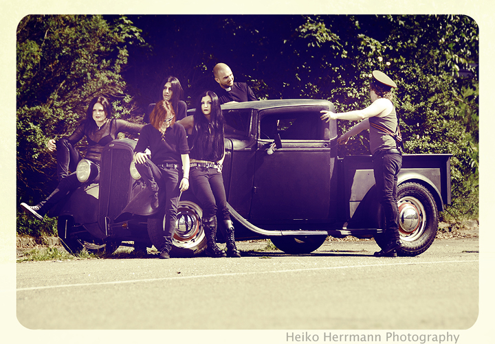 Catharsis. After the gig I wander about brandishing the empty Amaro Ramazzotti bottle. I feel fine, it’s a nice wild night, I exchange views with the bass player of the grunge band, I let my sweat dry on me, I chat to a guy who claims to be our fan but not to want an autograph cause he is “not a pussy”. I love every bit of it. The next day we have a photoshooting planned with Heiko on two sets, a barren clearing – where we pose with a ’38 chevrolet in a somewhat military-queer outfit – and a golf course. Mirko kept his priest’s outfit, Roman has a red army’s hat, bare feet and he’s wearing Nunzio’s heart covered guitar belt as a dictator’s band. We’re all in rigorous total black outfits and it’s stifling hot, but we enjoy ourselves like kids, running around in fields as green as green goes, with golf clubs in our hands. In the evening we celebrate with wine and bruschetta at Heiko and his girlfriend Benita’s place. A few more quick sketches: a scratch from Mimi, the couple’s cat, as Annika threw her at me. Sharing a bed with both the Pandora girls and being afraid of mixing up arms and legs in the tangle of bodies and finally Mia screaming in her sleep in the middle of the night as she was answering a far away phone call (“Haloooooooooooooooooooooo? Haloooooooooooooooooooooooo???”).