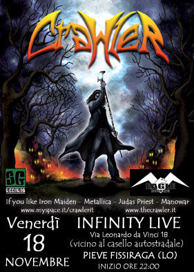 Italian Heavy Metal band, CRAWLER has announced an event on facebook that the band will perform their gigs at INFINITY LIVE, Pieve Fissiraga. The show will be on Friday, November 18 at 10:30pm and November 19 at 1:30am .