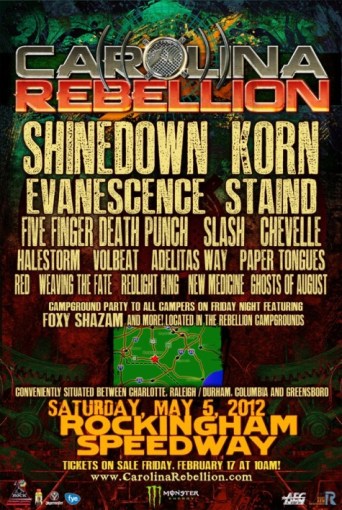 Carolina Rebellion returns Saturday, May 5 bigger and better than ever and boasting a solid rock lineup for the multi-stage festival, including SHINEDOWN, KORN, EVANESCENCE, STAIND, FIVE FINGER DEATH PUNCH and SLASH.