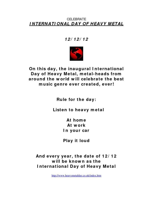 This day, 12/12/12 is the inaugural day but every year on 12/12 will now be known as the International Day Of Heavy Metal…