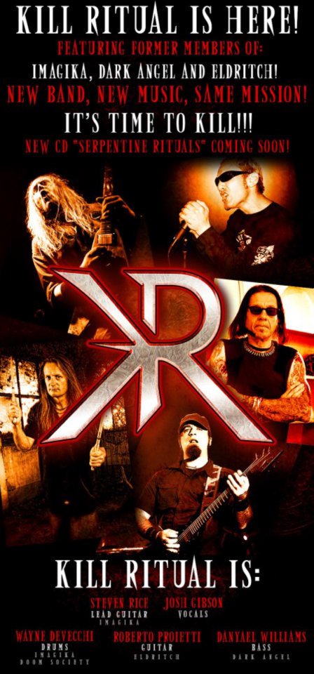 Kill Ritual, which recently signed a worldwide management deal with Germany’s Rock N Growl Management, consists of the following musicians: Josh Gibson – Vocals, Steven Rice – Guitar (ex Imagika), Roberto Proietti- Guitar (ex Eldritch), Danyael Williams – Bass (ex Dark Angel), Wayne DeVecchi – Drums (ex Imagika).