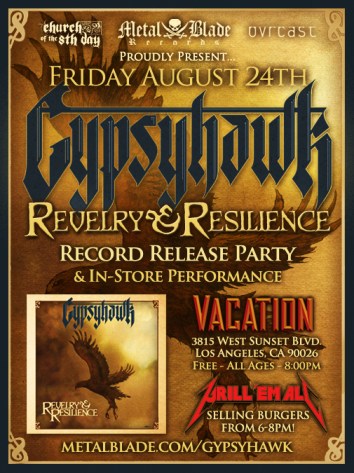 In other news, Gypsyhawk will be celebrating the release of their second album, Revelry & Resilience, with an in-store performance at Vacation Vinyl in Los Angeles, Calif. The album release party/performance is FREE and will be held on August 24th at 8:00pm. Additionally, ‘The Great Food Truck Race’-winning Grill ‘Em All truck will be serving their critically-acclaimed, metal-themed burgers before the show from 6:00pm-8:00pm. Gypsyhawk andMetal Blade invite all fans from the greater-LA area to help celebrate the release of Revelry & Resilience and crush some burgers!