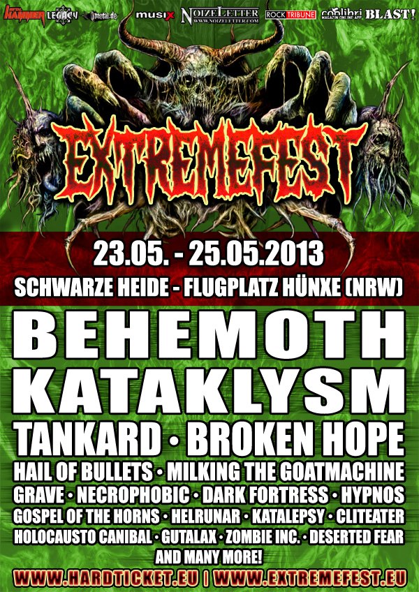 2012 marks the unholy birth of the one and only EXTREMEFEST – the first issue of the festival sated the bloodthirst of thousands of extreme metal fans in Germany, Austria and Switzerland over the course of three days! We partied with big names such as EXODUS, SUICIDE SILENCE, CANNIBAL CORPSE, NASUM or ASPHYX and sweated in countless circle pits…over 70 bands with a stylistic variety ranging from black, death, thrash, grindcore all the way to modern deathcore sounds decided to drop by. Unbeatable, you say? Fear not: the lads and ladies behind the EXTREMEFEST are on a mission to deliver another scorching line up for 2013 – to make sure you`ll get the most brutal party in this solar system!!!