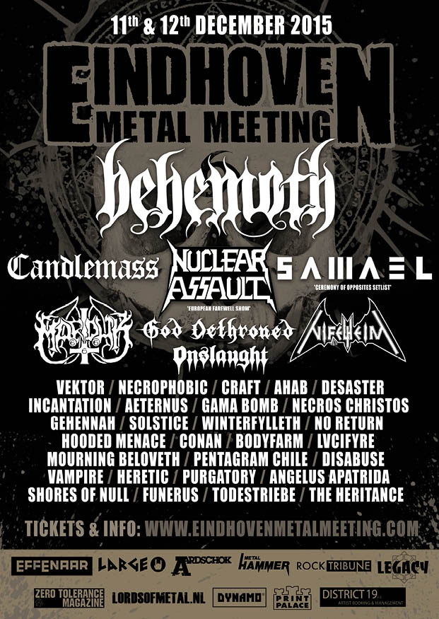 With the addition of NUCLEAR ASSAULT, CRAFT, GAMA BOMB, ANGELUS APATRIDA, AETERNUS, INCANTATION, PENTAGRAM CHILE, FUNERUS, BODYFARM, HERETIC & THE HERITANCE the line-up for Eindhoven Metal Meeting 2015 is now complete. The seventh edition of the annual metal meeting is set to take place December 11 & 12th, 2015 at the reputable Effenaar venue in Eindhoven, The Netherlands.