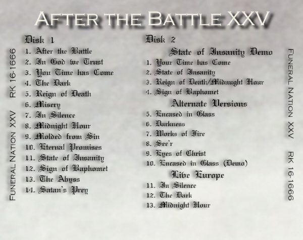 FuneralNation-After The Battle XXV-song listing Posted by metalshockfinland on August 23, 2016 This is an image for FUNERAL NATION: “After The Battle” – 25th Anniversary Double CD Reissue Available. Images navigation ← Previous