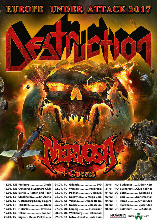 After the first successful touring leg in September/October 2016, legendary German thrashers, DESTRUCTION, return with their “Europe Under Attack 2017” tour in January/February. Support on this trek will come from Brazilian thrash metal institution NERVOSA and a special guest. More details coming soon, find all current dates below!