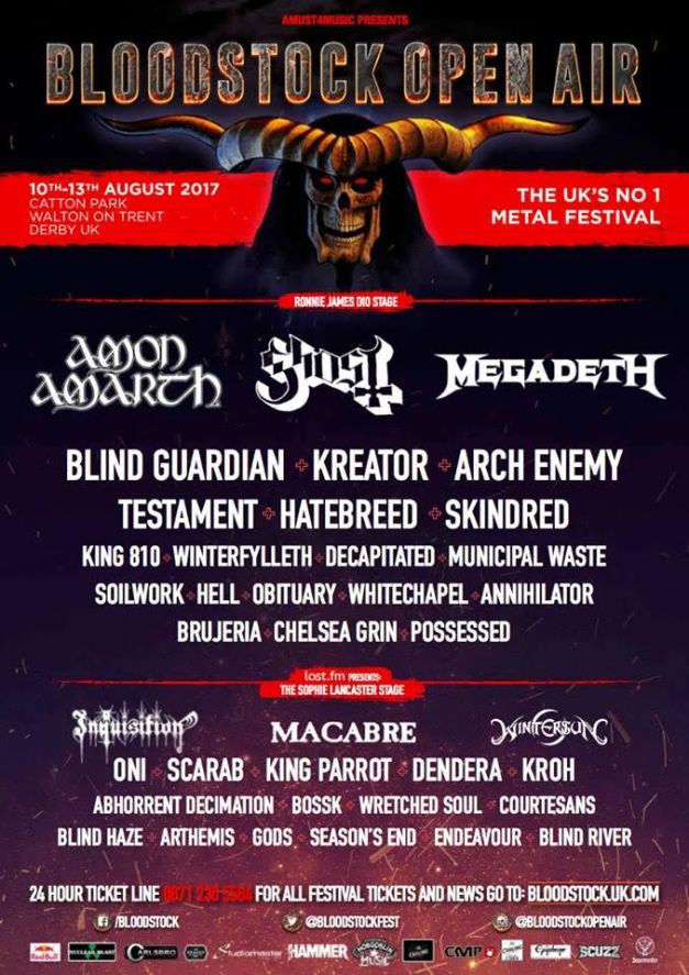 Already announced for 2017 are our three headliners AMON AMARTH, GHOST, and MEGADETH, plus ARCH ENEMY, KREATOR, BLIND GUARDIAN, HATEBREED, TESTAMENT, OBITUARY, KING 810, BRUJERIA, WHITECHAPEL, SKINDRED, POSSESSED, ANNIHILATOR, MUNICIPAL WASTE, HELL, DECAPITATED, SOILWORK, CHELSEA GRIN, MACABRE, INQUISITION, KING PARROT, SCARAB, WINTERSUN, ONI, DENDERA, KROH, ABHORRENT DECIMATION, COURTESANS, WRETCHED SOUL, BOSSK and WINTERFYLLETH. Many more are still be announced! Stay tuned to BLOODSTOCK’s social media at https://www.facebook.com/bloodstock and https://twitter.com/bloodstockfest