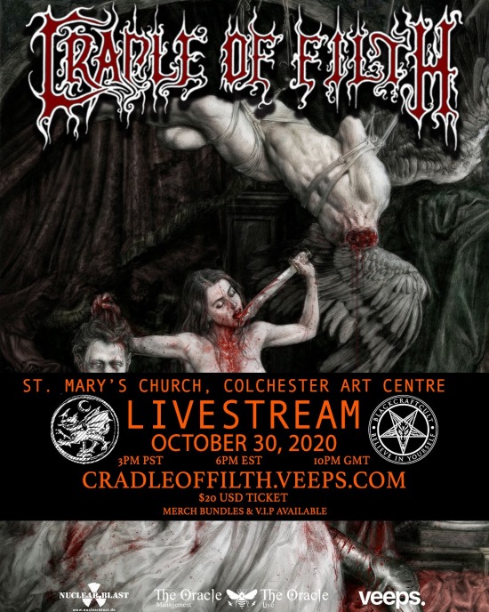 Despite the extremely difficult situation for musicians and concerts all over the world, Vampyric Masters of Extreme Metal, CRADLE OF FILTH, continue to appease their salivating fans by celebrating All Hallow’s Eve in style, even in 2020, the official year of the plague. This time the band, draped around lead singer Dani Filth, take it to the next far-flung tower by announcing a live stream concert from St. Mary’s Church, Colchester Art Centre, England for the auspicious date of October, 30th.