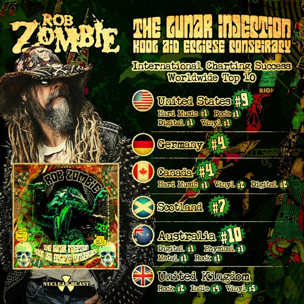 The Lunar Injection Kool Aid Eclipse Conspiracy is ROB ZOMBIE’s first No. 1 on Billboard’s Top Album Sales chart. The multiplatinum singer and filmmaker’s first album with Nuclear Blast cracked the top 10 in several countries, including Germany, Canada, Scotland, and Australia. In the United States, it’s Rob Zombie’s seventh consecutive Top 10 album since his first solo outing in 1998.