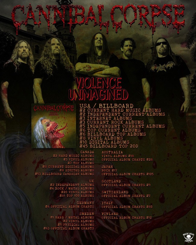 Earlier this month, CANNIBAL CORPSE released their critically acclaimed album, Violence Unimagined, via Metal Blade Records. For their efforts, the band landed on the worldwide charts, achieving some of the highest positions of their career: