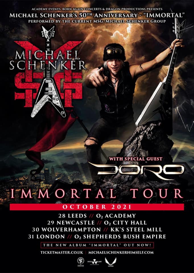 “After over a year sitting at home, I’m very happy to say that I’m finally going back out and joining the Metal Queen, DORO, and my brothers in her band for 4 shows in the UK supporting the mighty MICHAEL SCHENKER!”
