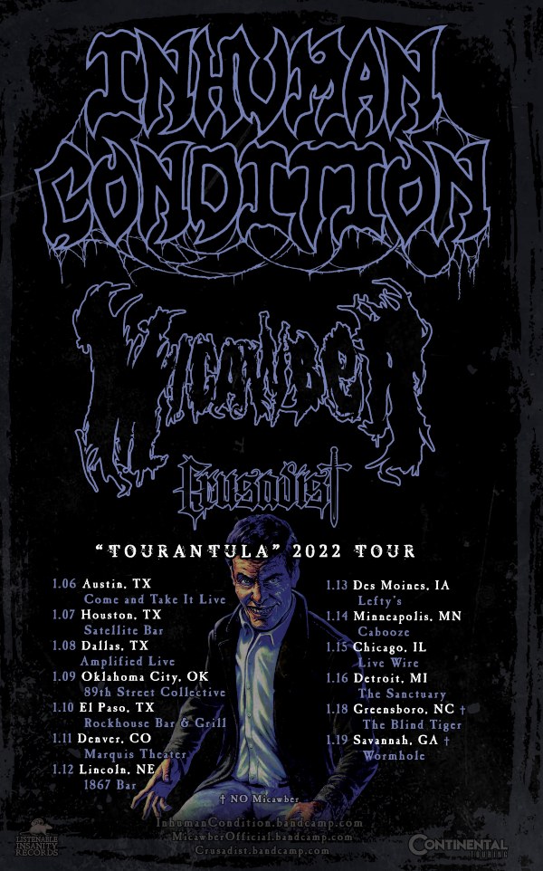 Floridian death metallers INHUMAN CONDITION have announced its second leg of their “Tourantula”, set to kick off January 6th. Joining the band on the 13-date run will come from MICAWBER and CRUSADIST, who were on the first leg of the Tourantula back in September.