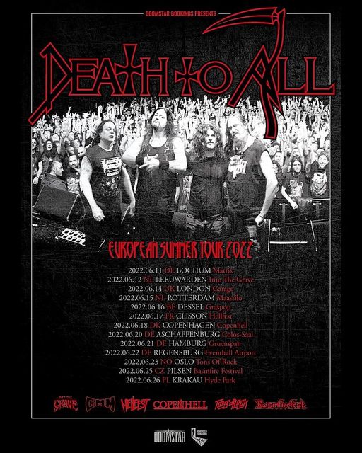DEATH TO ALL – feat. Gene Hoglan, Steve Di Giorgio, Bobby Koelble, Max Phelps – have announced their European Summer Tour 2022, kicking off on June 11th in Germany. See the show dates in the flyer below. Tickets at https://reversedrecords.com/death-to-all.