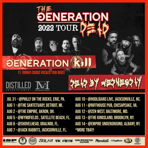 Generation Kill is an American thrash metal band formed in New York City in 2008 by Rob Dukes (ex-Exodus). Dukes, on hiatus from touring with Exodus, wanted to funnel his excess creative energy and aggression into something new. After the inclusion of Jason Trenczer, Lou Lehman and Sam Inzerra, the band began writing and recording their first album, Red, White, & Blood, featuring several hit singles including, “Feast for the Wolves” and “Hate” as well as a cover of Nine Inch Nails “Wish” which enjoyed heavy radio rotation.