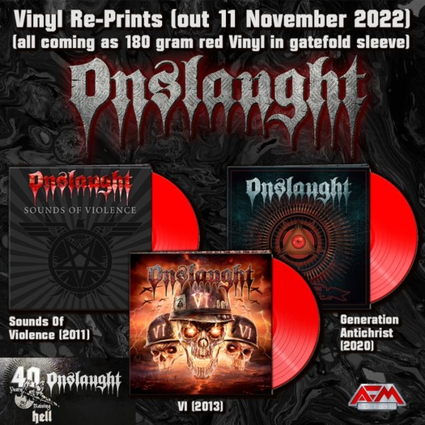 2022 sees one of the most influential and respected bands of their genre, led by Nige Rockett, celebrating its 40th anniversary and is doing so in style. Today, ONSLAUGHT are re-issuing their latest three studio albums “Sounds Of Violence“ (2011), “VI” (2013) and “Generation Antichrist” (2020) as red 180 gram Vinyl editions in gatefold sleeve. ONSLAUGHT have also released a special “Anniversary Edition“ of “Sounds Of Violence”, which now comes as a 2-CD digipak including a bonus CD.