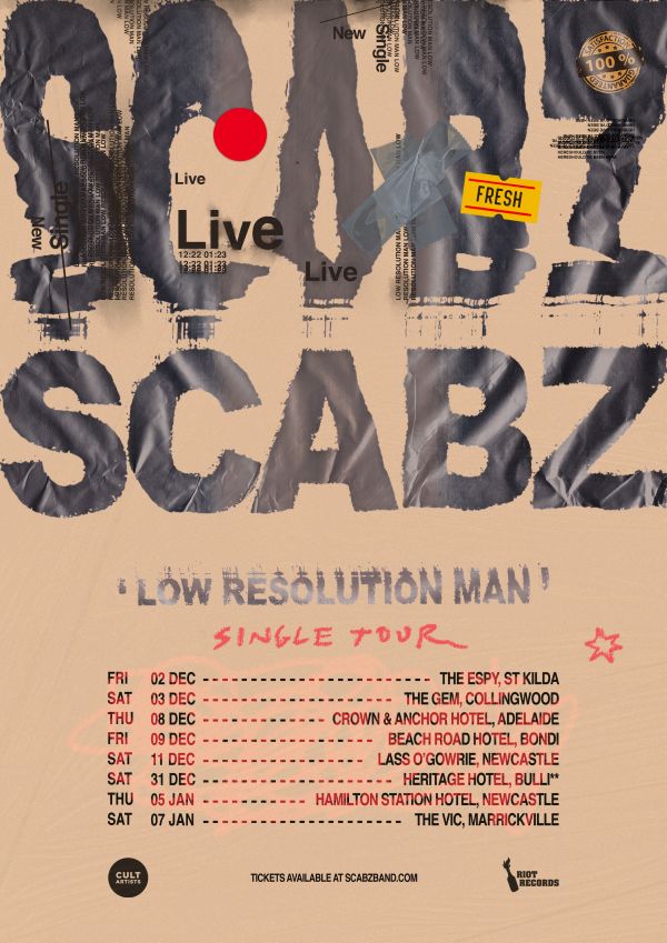 Say hello to SCABZ on their ‘Low Resolution Man‘ single tour! See the tour dates below. Free entry at all gigs except Bulli, check back for tickets HERE