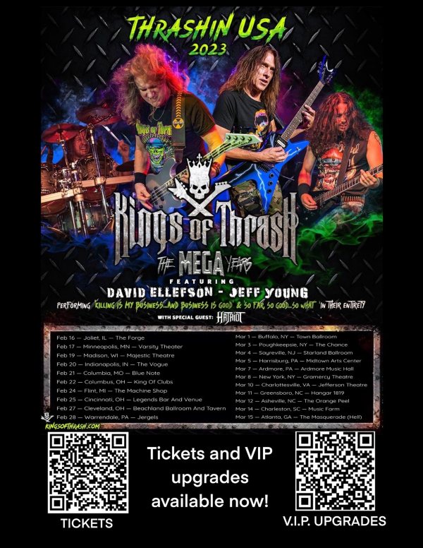 KINGS OF THRASH, featuring David Ellefson and Jeff Young, announced the first leg of their 2023 world tour that begins on February 16 in Joliet, Illinois at The Forge. The THRASHIN’ USA tour will cross the Midwest, East Coast, and southeastern part of the USA through March 15th. Kings of Thrash will be performing the Killing Is My Business…and Business Is Good and So Far, So Good…So What albums in their entirety. KINGS OF THRASH also feature Chaz Leon on vocals and guitar and Fred Aching on drums. Hatriot will be providing support for the tour.