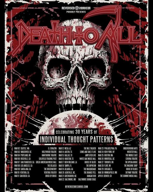 DEATH TO ALL – feat. Gene Hoglan, Steve Di Giorgio, Bobby Koelble, Max Phelps – are currently touring in North America, in celebration of “Individual Thought Patterns”. See the show dates in the flyer. Tickets & VIP Upgrades: https://www.national-acts.com/dta.