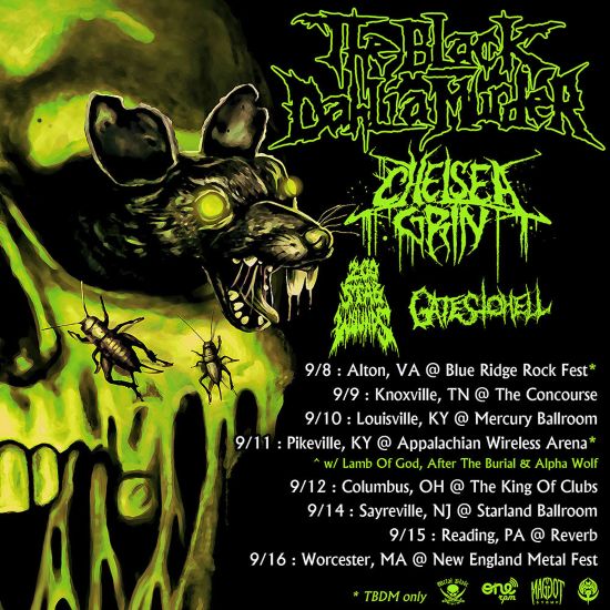 Following their wildly successful Verminous Remnant Spring headlining tour, THE BLACK DAHLIA MURDER today announces a final bout of shows before returning to the studio to complete their next studio album. The short journey, which begins on September 8th at Blue Ridge Rock Fest in Alton, Virginia and closes on September 16th at the New England Metal Fest in Worcester, Massachusetts, includes a performance alongside Lamb Of God in Pikeville, Kentucky. Support will be provided by Chelsea Grin, Gates To Hell, and labelmates, 200 Stab Wounds, on select shows. Tickets go on sale this Friday, June 16th at 10:00am local time. See all confirmed dates below.