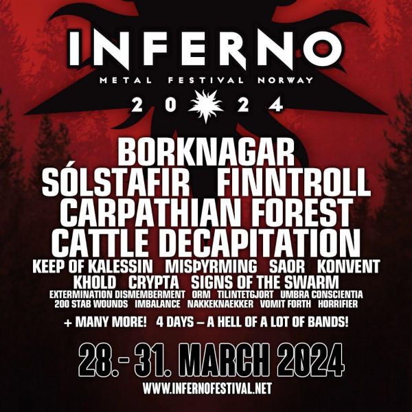 Inferno Metal Festival is now revealing the second wave of bands for its 2024 edition, taking place from March 28-31, 2024 across several venues in Oslo (NO). So far, the iconic festival is revealing a mixture of classic bands as well as some vital and exciting new-comers! The already impressive lineup now includes Carpathian Forest, Cattle Decapitation, Signs of the Swarm, Umbra Conscientia, 200 Stab Wounds and Vomit Forth. More will be announced soon!