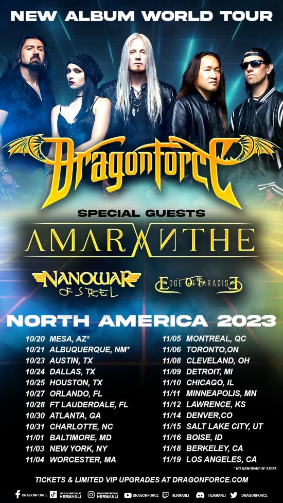 DRAGONFORCE just announced that guitarist, singer and content creator Billy Wilkins will join them on their entire fast-selling North American headline tour that kicks off this week. Wilkins already joined the band on stage after they saw his cover of platinum single “Through the Fire and Flames” going viral on TikTok. Featuring a brand-new setlist and stage production, as well as special guests AMARANTHE, NANOWAR OF STEEL and EDGE OF PARADISE, the tour will captivate and amaze fans everywhere. Grab your tickets, make sure to pre-order your copy of Warp Speed Warriors and check out the new music video for “Power of the Triforce” now!