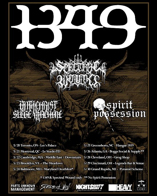 Norwegian black metal legends, 1349, will tour Eastern Canada and the U.S. this May, around their first appearance at Maryland Deathfest. Joining 1349 on this tour are Canadian occultists Spectral Wound, Richmond’s Antichrist Siege Machine and Oregon’s Spirit Possession.