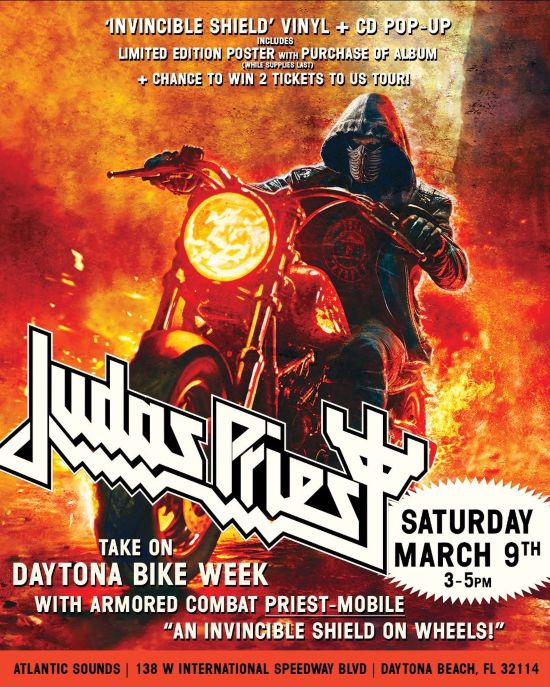 If you live near Daytona Beach, you will be able to experience a special Judas Priest pop-up shop on Saturday, March 9th from 3-5pm at Atlantic Sounds, which will be operating out of a custom Judas Priest military combat truck – “an invincible shield on wheels” – playing the album to the 500K+ attendees at Daytona Bike Week. Harley Davidson will be leading a 100-biker brigade from Orlando to Daytona at 9AM ET.