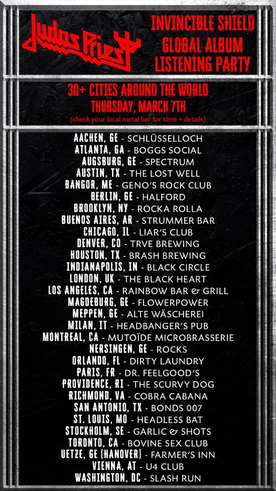 There will be a global album listening party for JUDAS PRIEST‘s latest metal masterpiece, Invincible Shield, on Thursday, March 7th at various metal bars in 30 cities around the world. Check your local metal bar for exact time and details, many of which will also be offering giveaways and custom Judas Priest-themed cocktails for their event.
