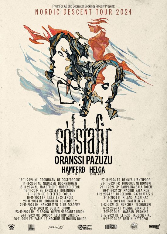 SÓLSTAFIR comments on the tour: “We are coming back with long shows, new songs, and old pearls. Ever since we played with ORANSSI PAZUZU in Transylvania back in 2012 we have been fans of them, so we are very happy to be taking them on the road with us. Joining us as well, are our friends in HAMFERÐ who we played with in their home country back in 2013. HAMFERÐ will, and the other half will be our newest friends in HELGA.”