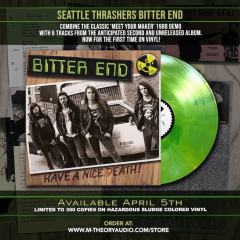 ‘Have a Nice Death!’ collects the band’s classic 1988 ‘Meet Your Maker’ 4-song demo plus their early ‘90s recordings (6 songs) that were the beginnings of their unrealized 2nd full length album. Available on Hazardous Sludge colored vinyl the album will be in stores or available via mail-order at www.m-theoryaudio.com/store or Bandcamp www.bitterendseattle.bandcamp.com