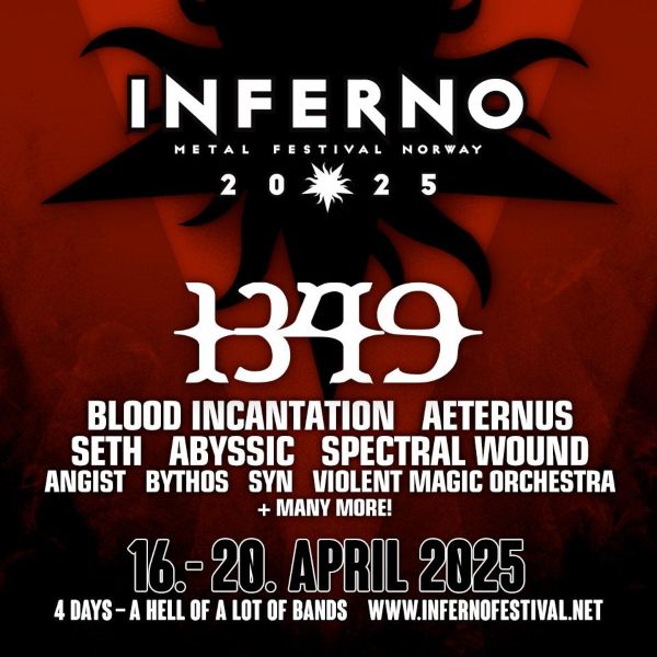 INFERNO FESTIVAL NORWAY 2025 is pleased to reveal the first wave of bands for next year’s highly anticipated edition, which will once again take place in Oslo (NO) from April 17-20 for another blasphemous Easter! The festival now welcomes 1349, BLOOD INCANTATION, AETERNUS, SETH, ABYSSIC, SPECTRAL WOUND, ANGIST, BYTHOS, VIOLENT MAGIC ORCHESTRA + SYN to the lineup, with more TBA! Tickets and passes can be found HERE.