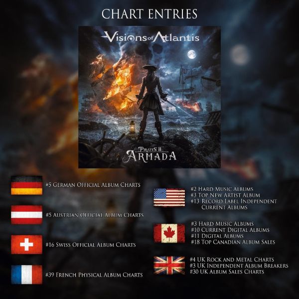 The pirates of VISIONS OF ATLANTIS have topped the charts worldwide, reaching #5 on the Official German Album Charts, #5 on the Official Austrian Album Charts, #4 on the UK Rock Charts, #30 on the UK Official Sales Charts, #16 on the Official Swiss Album Charts, #2 on the US Hard Music Album Charts, #3 on the Canadian Hard Music Album Charts and #39 on the French Physical Album Charts – to only name a few – with their new album, Pirates II – Armada.