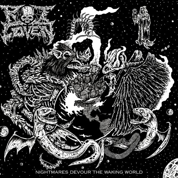 ROT COVEN‘s first physical release “Nightmares Devour the Waking World” pairs two full-length albums: Phase I (initally self-released through the duo’s bandcamp) and the unreleased follow-up Phase II. Phase I builds colossal sludge riffs out of lurking death industrial dronescapes with the final track erupting into a supernova of scorching psychedelic leads and almost “doomgaze” melodicism, while Phase II descends deeper into the abyss, adding elements of unrelentingly ugly death metal to their apocalyptic scum-dirge.