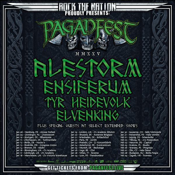 “I’m so happy to announce Paganfest returning after 10 full years. It’s gonna’ be a great package with Alestorm, Ensiferum, Týr, Heidevolk and Elvenking. Coming in January – February 2025. See you at the shows!”