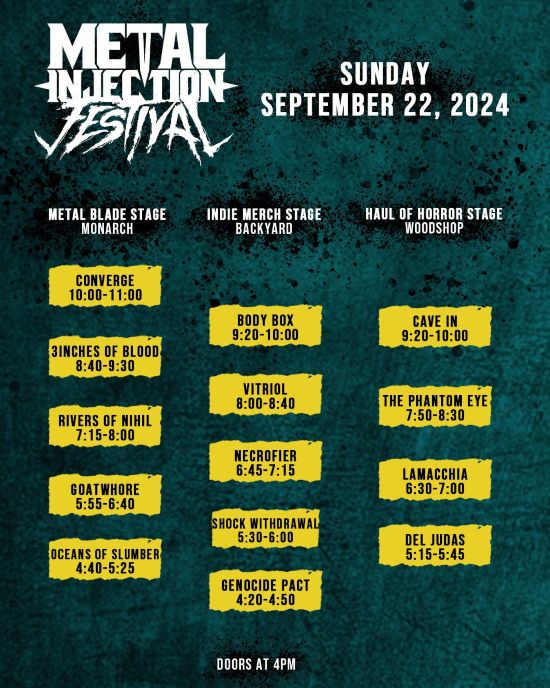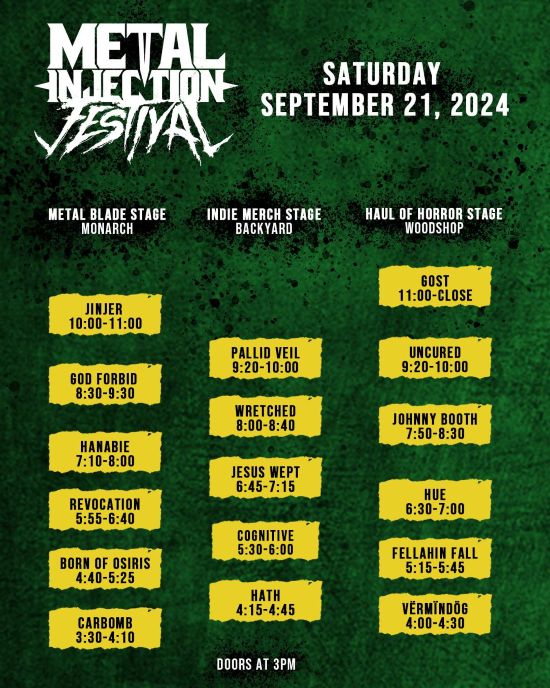 Metal Injection Festival is pleased to now reveal the daily set times for its upcoming second edition! In celebration of the 20th anniversary of Metal Injection, the event will be hitting the streets of the website’s origins in New York at Brooklyn Monarch & Meadows on September 21 & 22. Join us for the ultimate party as single day tickets and weekend passes are now available!