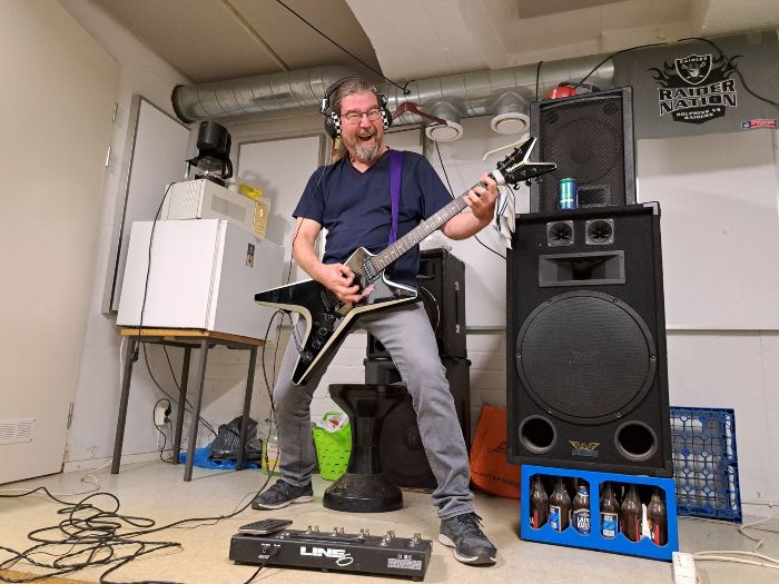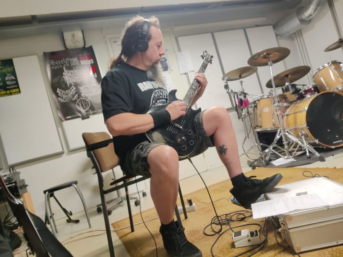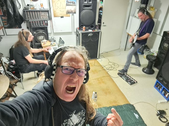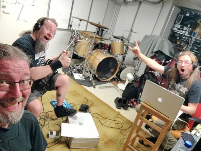 All drum- and rhythm guitar tracks done, it´s time to focus on solos, vocals and the secret ingredients. Those being the extra guitar- and-what-not noises. And some backing choirs, in this case shouting and growling by angry men. Lots to do, still rewriting some lyrics, because there are cases of a song having too much lyrics and on some other song has a bit too little. All about balance and artistry…NOT! Just the fact that even these songs must be adaptable for live shows and it´s not fun to stumble on lyrics. More studio updates coming, as we slowly but surely proceed…”