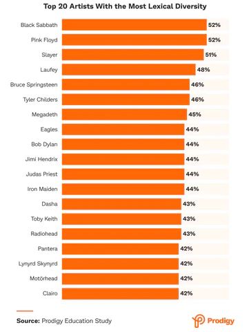 For many Metal fans, the results may not be surprising: some of the genre’s most renowned bands dominate the top spots in the study. Black Sabbath, considered pioneers of Heavy Metal, share the top position with the legendary Rock band Pink Floyd, both achieving 52% lexical diversity.