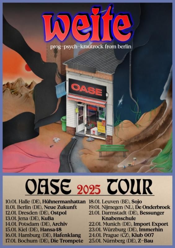 In support of their new studio offering “Oase”, released on November 22, 2024 through Stickman Records, Weite — the prog-psych/krautrock band featuring Nicholas DiSalvo (Elder, Delving), Michael Risberg (Elder, delving), Ingwer Boysen (delving), Ben Lubin (Lawns) and Fabien deMenou (Perilymph) — have geared up for their much-awaited album release tour, kicked off yesterday, Friday in Halle, Germany! Make sure to catch Weite live at the following dates: