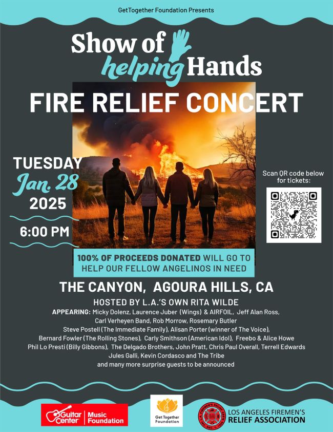 In reaction to the devastating situation that Los Angeles has been experiencing with the wildfires, the Get Together Foundation in cooperation with Rock Cellar Productions is making a difference. Plans are set for a fire relief concert that will take place on Tuesday, January 28, 2025, starting at 6:00PM at The Canyon in Agoura Hills, CA. LA-based musicians will unite for the “SHOW OF HELPING HANDS” –an evening of live music and more in support of this worthy cause. Hosted by LA’s own Rita Wilde, the line-up will include: Micky Dolenz, Laurence Juber (Wings) & AIRFOIL, Jeff Alan Ross (Peter Asher, The Lovin’ Spoonful), Carl Verheyen Band, Bernard Fowler (The Rolling Stones), Rob Morrow, Rosemary Butler, Steve Postell (The Immediate Family), Phil LoPresti (Billy Gibbons), Alisan Porter (winner of The Voice), Freebo & Alice Howe, Carly Smithson (American Idol), The Delgado Brothers, Kevin Cardasco, John Pratt, and The Tribe, with more to be announced.