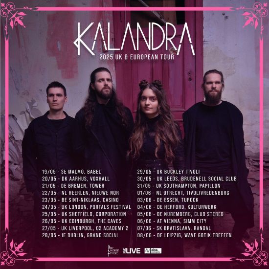 On the heels of their first headline tour, and the release of their second studio album ‘A Frame of Mind’ in 2024, Kalandra will be heading out on the road once again! With two albums and a soundtrack to their name the band are slowly but surely cementing themselves as a genre-unifying live act.