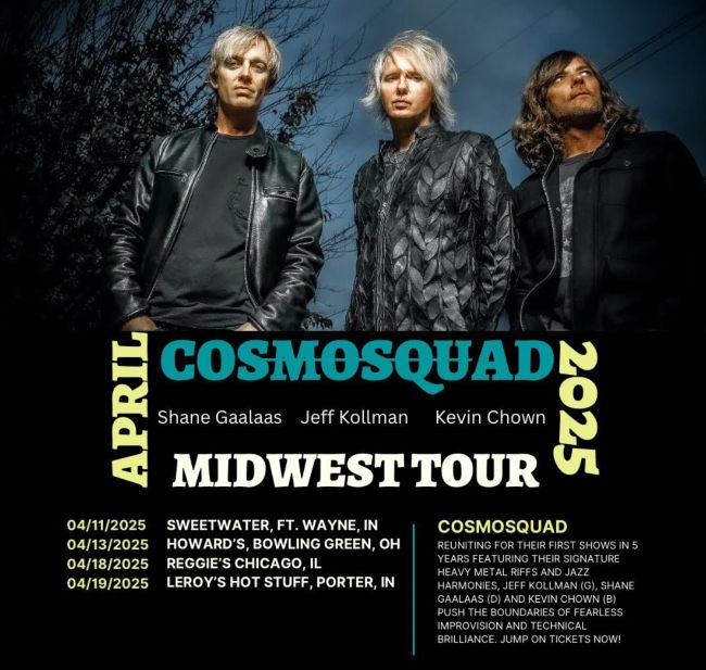 Veteran progressive rock fusion trio Cosmosquad has announced a highly anticipated Midwest tour for April 2025, marking the band’s first live performances in over five years. The tour will feature the group’s classic lineup, including guitarist Jeff Kollman, drummer Shane Gaalaas, and bassist Kevin Chown.