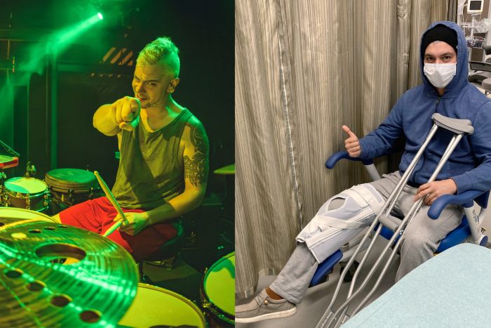 On the evening of April 25th, our beloved drummer and founder Yoyo was in a bike accident after a recording session in Orange County, CA. Thankfully, he was wearing a helmet — which likely saved his life — but he suffered a fracture to his right tibial plateau (knee), leaving him unable to walk or play drums for at least the next 6 weeks.