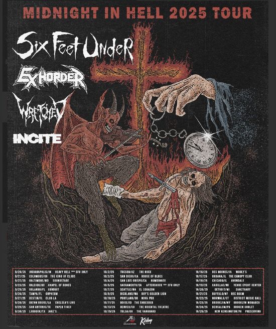 SIX FEET UNDER will return to stages this Fall on a US headlining tour. The Midnight In Hell 2025 Tour runs from September 20th in Indianapolis, Indiana through October 25th in New Kensington, Pennsylvania and includes a special performance at this year’s edition of Aftershock. Support will be provided by Exhorder, Wretched, and Incite.
