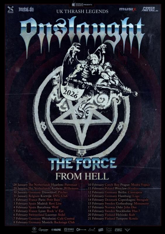 Continuing the explosive success of their still ongoing “Power From Hell” tour and their career-defining double-album “Origins Of Aggression” (released on May 23, 2025 via Reigning Phoenix Music), the band are ready to turn the pit into chaos once more with their “The Force From Hell” tour. In early 2026, they’ll be bringing the ultimate thrash assault to 22 cities all over the continent – a full-on fusion of their iconic debut “Power From Hell” and the 40th anniversary celebration of “The Force.”