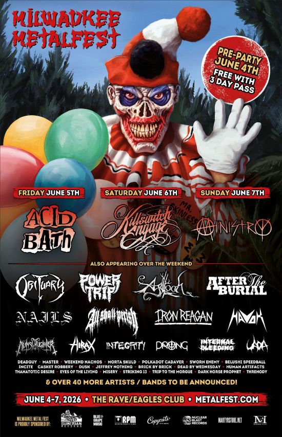 Milwaukee Metal Festival 2026 is pleased to now reveal the headliner day splits! ACID BATH will conquer Friday, followed by KILLSWITCH ENGAGE on Saturday with newly added headliner MINISTRY to close out the weekend! In addition, the festival has announced over 20 new additions, which can be found below!