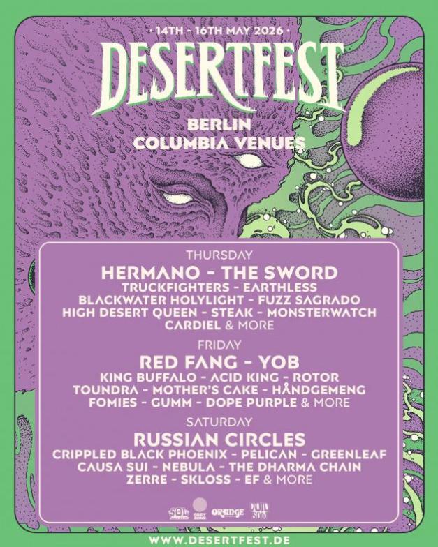 Desertfest Berlin 2026 takes place from May 14–16, 2026 at Columbiahalle and Columbia Theater. Tickets and venue sleep-over options are available at: www.desertfest-tickets.de