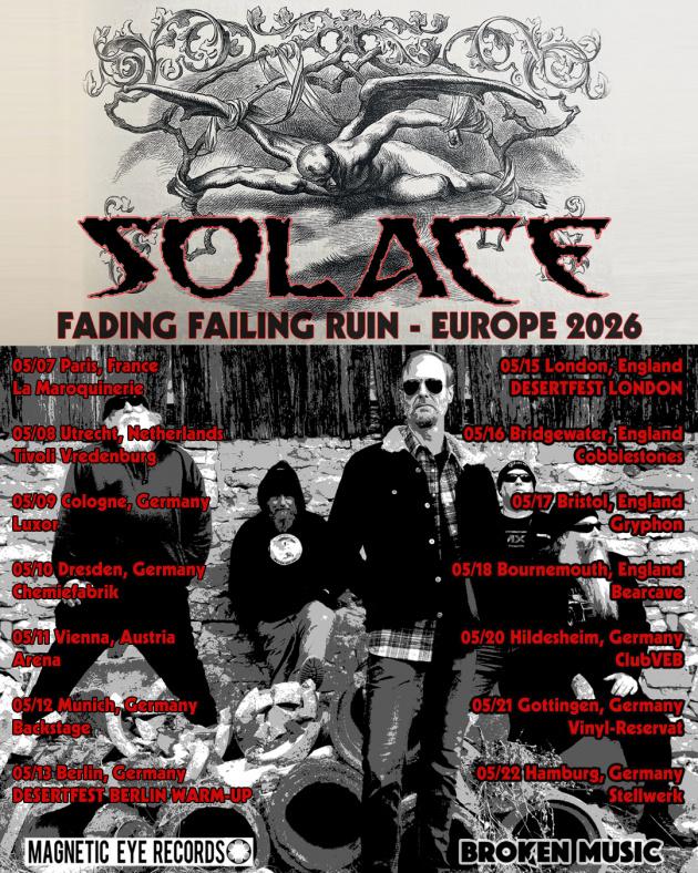 Amazing news for old continent fans of the stoner rock underground: SOLACE will return to Europe on tour in May 2026 on their “Fading Failing Ruin” tour just ahead of releasing their new album, including two festival slots and a string of shows as direct support for HERMANO (feat. former KYUSS vocalist John Garcia).