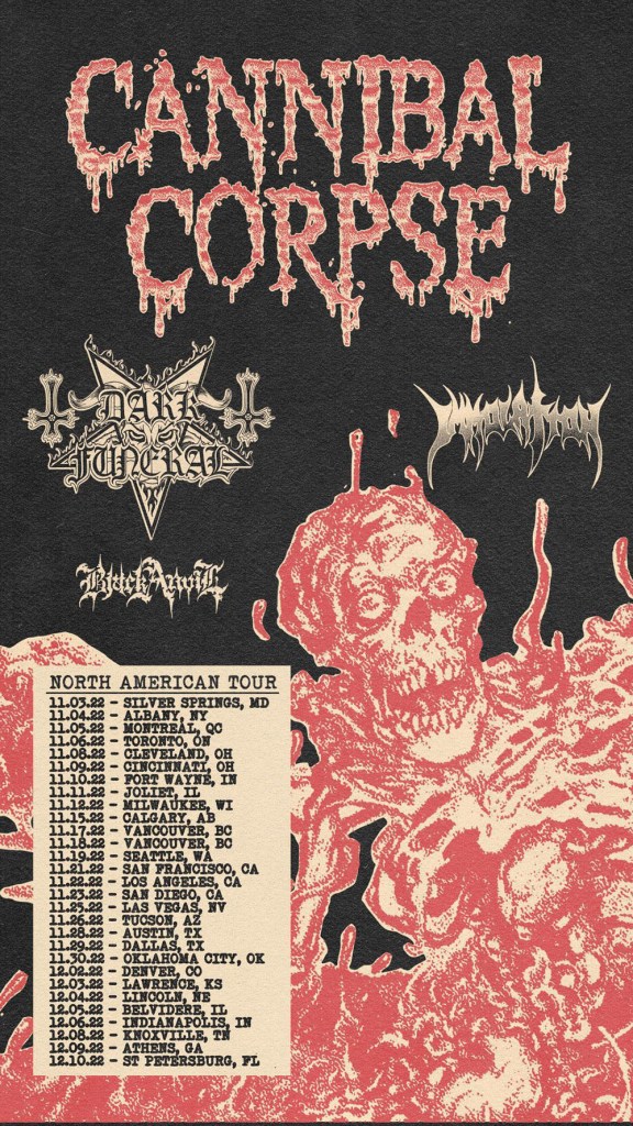 CANNIBAL CORPSE: 9/08/2022 Blue Ridge Rock Festival @ Virginia International Raceway – Alton, VA w/ Dark Funeral, Immolation, Black Anvil: 11/03/2022 The Fillmore – Silver Springs, MD 11/04/2022 Empire Live – Albany, NY 11/05/2022 MTELUS – Montreal, QC 11/06/2022 Danforth Music Hall – Toronto, ON 11/08/2022 The Agora – Cleveland, OH 11/09/2022 Bogart’s – Cincinnati, OH 11/10/2022 Piere’s Entertainment Center – Fort Wayne, IN 11/11/2022 The Forge – Joliet, IL 11/12/2022 The Rave II – Milwaukee, WI 11/15/2022 The Palace Theatre – Calgary, AB 11/17/2022 The Rickshaw Theatre – Vancouver, BC 11/18/2022 The Rickshaw Theatre – Vancouver, BC 11/19/2022 The Showbox – Seattle, WA 11/21/2022 Regency Ballroom – San Francisco, CA 11/22/2022 The Wiltern – Los Angeles, CA 11/23/2022 The Observatory North Park – San Diego, CA 11/25/2022 House Of Blues – Las Vegas, NV 11/26/2022 Encore – Tucson, AZ 11/28/2022 Empire Garage – Austin, TX 11/29/2022 House Of Blues – Dallas, TX 11/30/2022 Diamond Ballroom – Oklahoma City, OK 12/02/2022 Decibel Magazine Metal & Beer Fest @ Summit Music Hall – Denver, CO 12/03/2022 The Granada – Lawrence, KS 12/04/2022 Bourbon Theatre – Lincoln, NE 12/05/2022 The Apollo Theatre AC – Belvidere, IL 12/06/2022 The Vogue Theatre – Indianapolis, IN 12/08/2022 The Concourse – Knoxville, TN 12/09/2022 Georgia Theatre – Athens, GA 12/10/2022 Jannus Live – St. Petersburg, FL