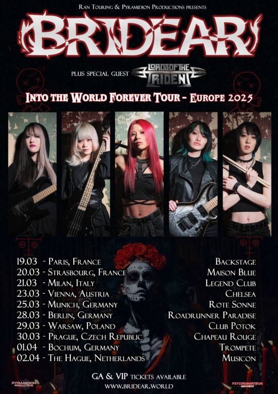 The “Into the World Forever” tour originally kicked off in Australia in October 2024, when BRIDEAR supported metal icons DREAM EVIL before returning to Japan for a run of successful headline shows. Special guest for the EU shows 2025 will be the American immortal power metal warriors LORDS OF THE TRIDENT.